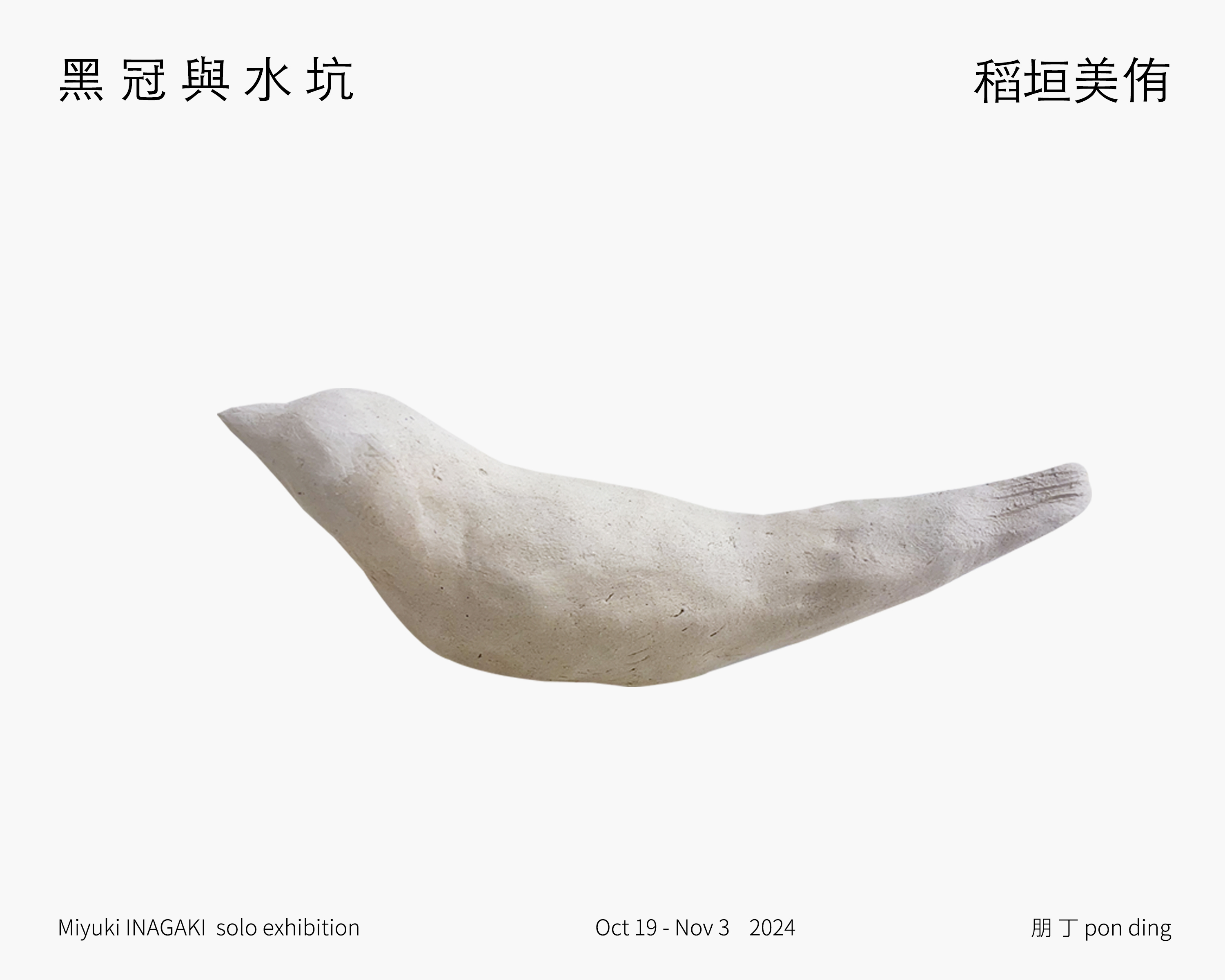 2024年5月,日本藝術家稻垣美侑為了此次朋丁個展前來台灣取材。她總是在生活中尋找能夠開啟想像的風景,此次也爲了探尋當地的面貌而展開旅程。展覽的標題取自於她遊走於台灣路上感受到的心動風景——「黑冠」和「水坑」。這兩者的共同點都是由當地的自然環境孕育而成,存在著漫長歲月。此次展出的作品,不僅是稻垣美侑個人經歷過的風景,同時也是她從自由在台灣街頭漫步的「黑冠麻鷺」所看到的世界,引發的想像而延展出來。
